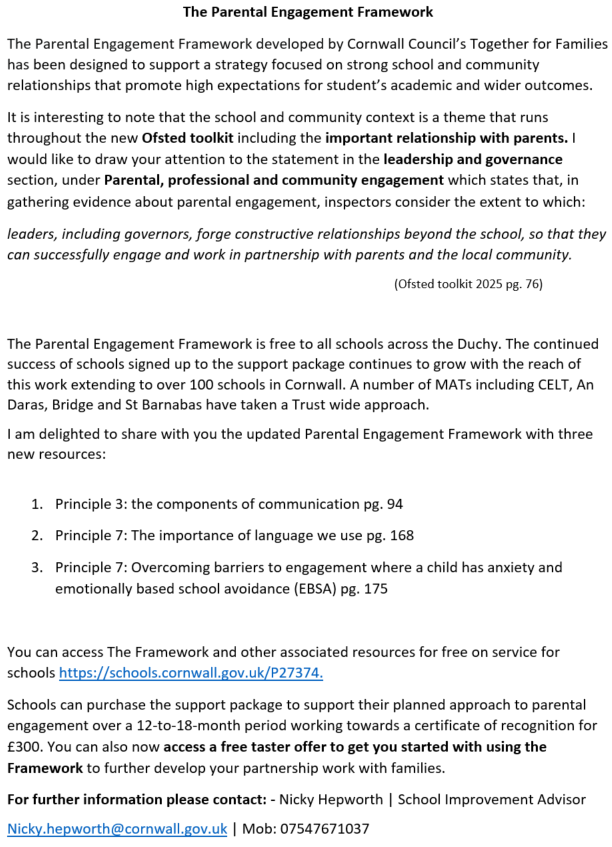 Effective parental engagement is a crucial ingredient in both academic and social success, especially for our most vulnerable pupils. Cornwall Council’s Together for Families Directorate, supported by Parent Carer Cornwall, have developed a framework and toolkit to promote the partnership between pupils, parents, and school to help create a culture of mutual collaboration to support all learners to succeed. This, used in conjunction with the Transforming Attendance in Cornwall toolkit is proving very effective in schools in our region.